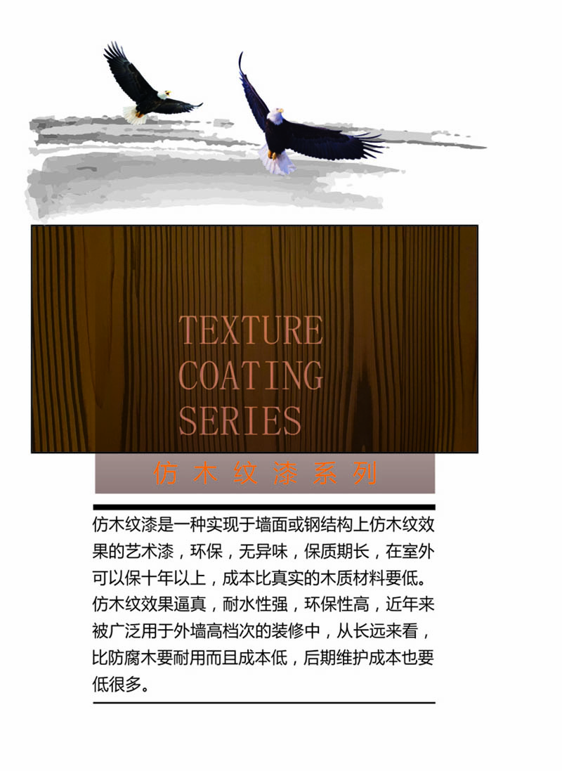 仿木紋漆是水性藝術涂料、性能卓越、無毒無味、無污染、涂膜附著力強、阻燃、耐擦洗、而酸堿、不腿色。呈現各種木紋狀藝術圖案,圖案隨意、細膩、無接縫、不起皮、不開裂,底色和面色可以自由搭配,圖案可任意創作。