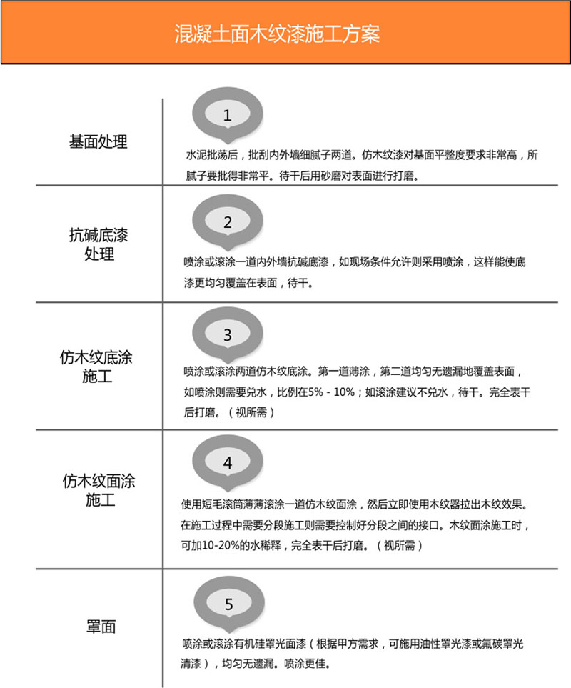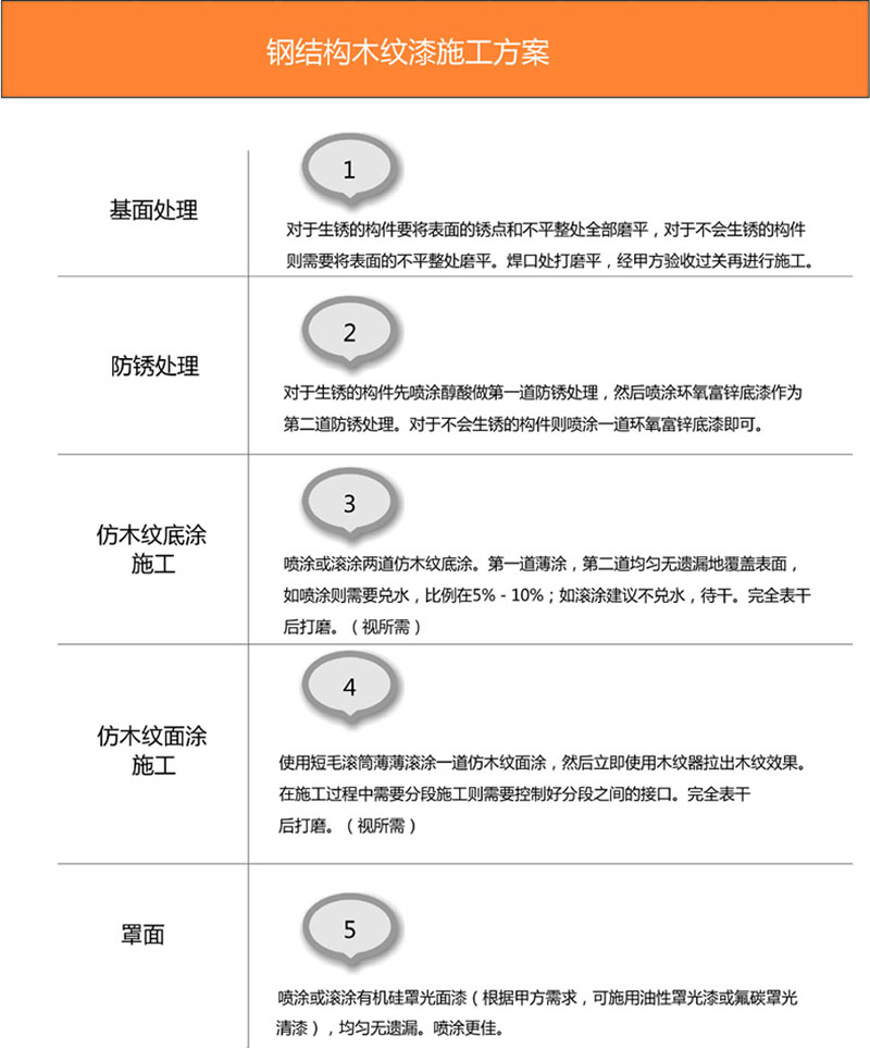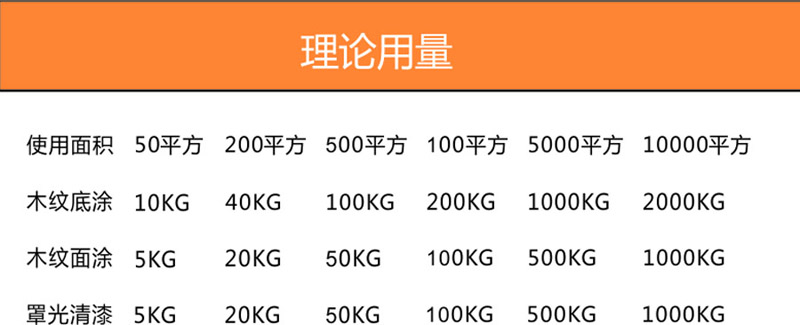 木紋漆底漆(0.2kg/平方米)、木紋漆面漆(0.1kg/平方米)、水性硅丙罩面漆