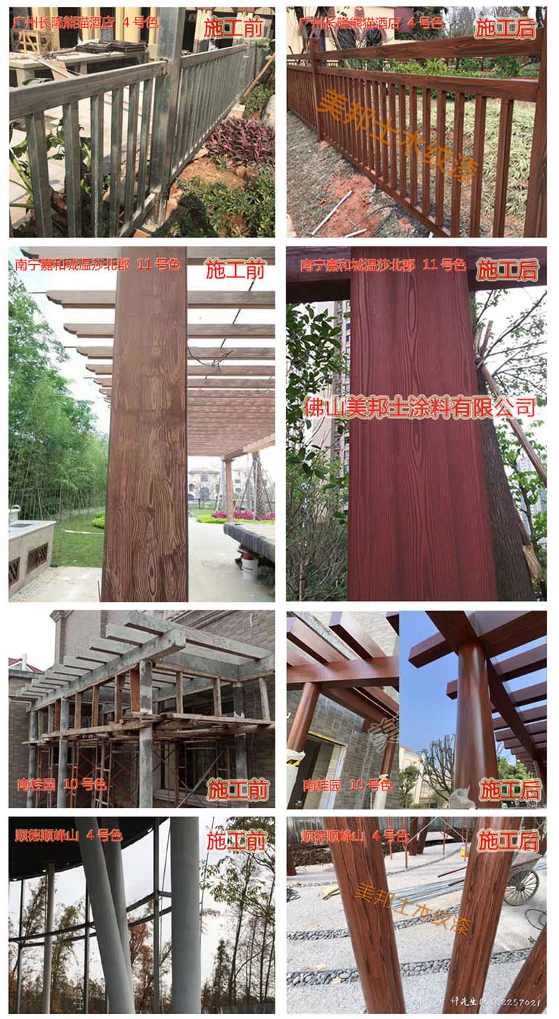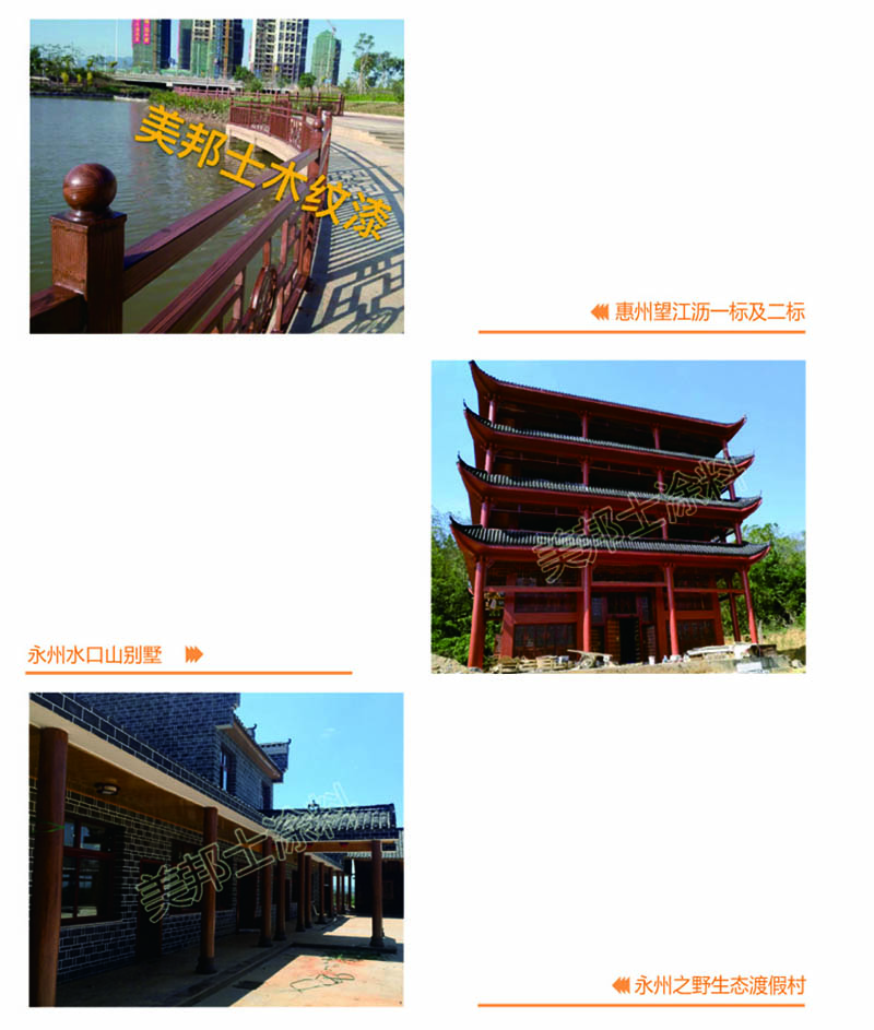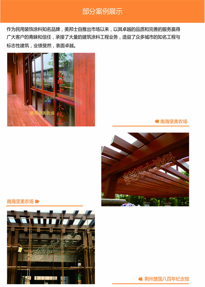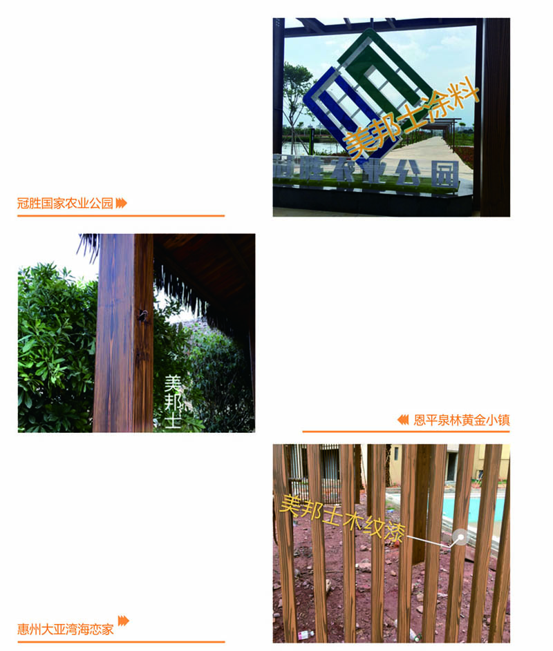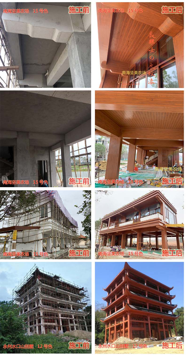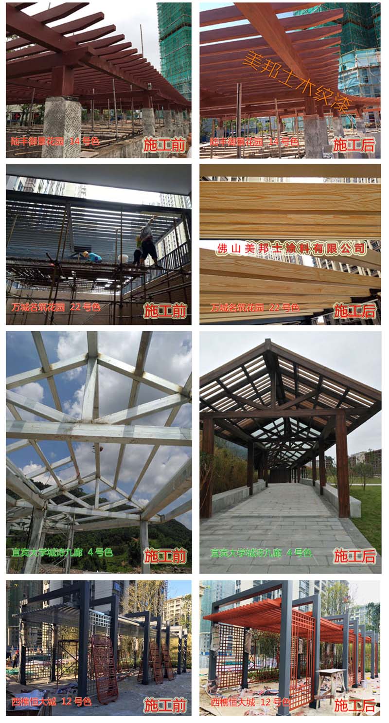 適用于辦公樓、賓館、住宅、廠房等外墻涂裝,車庫上方葡萄架、廊架、鐵架、涼亭等鋼結構木紋外觀涂裝。