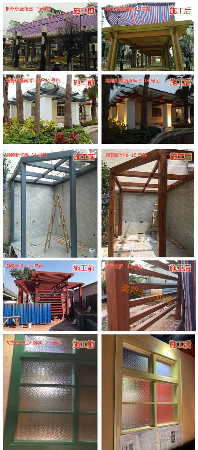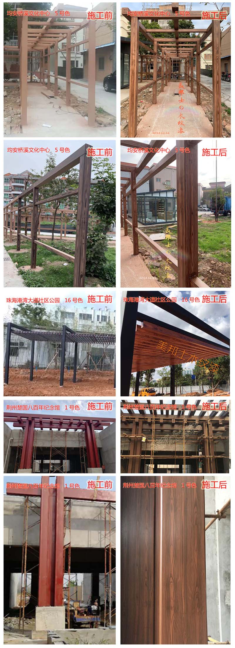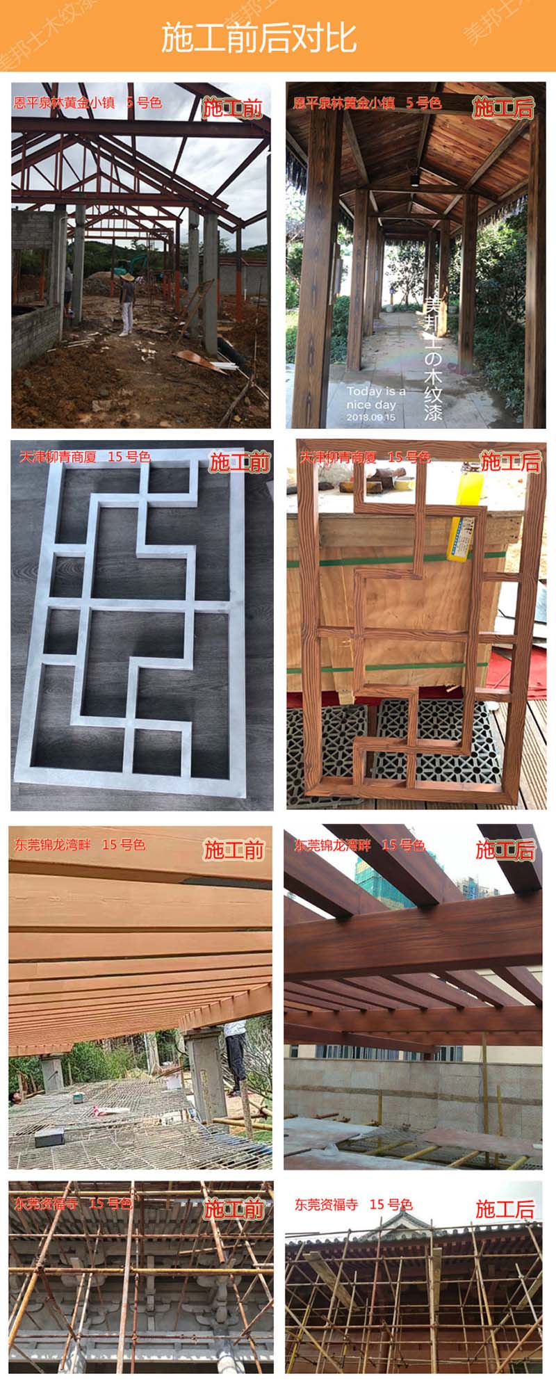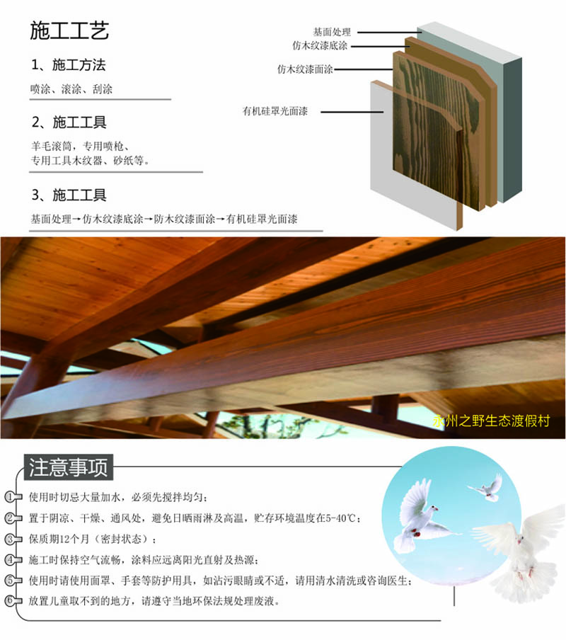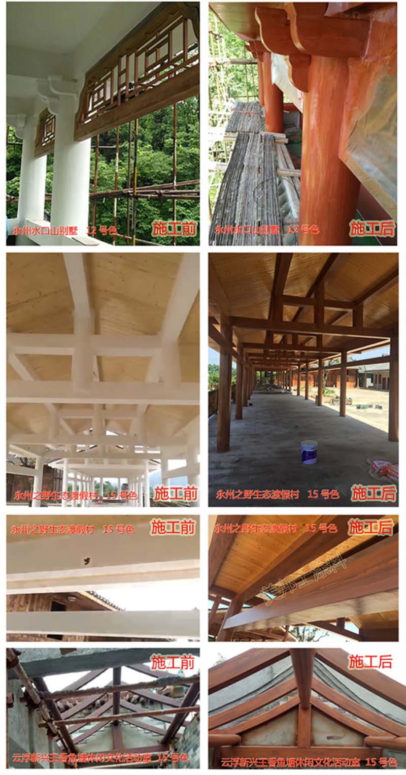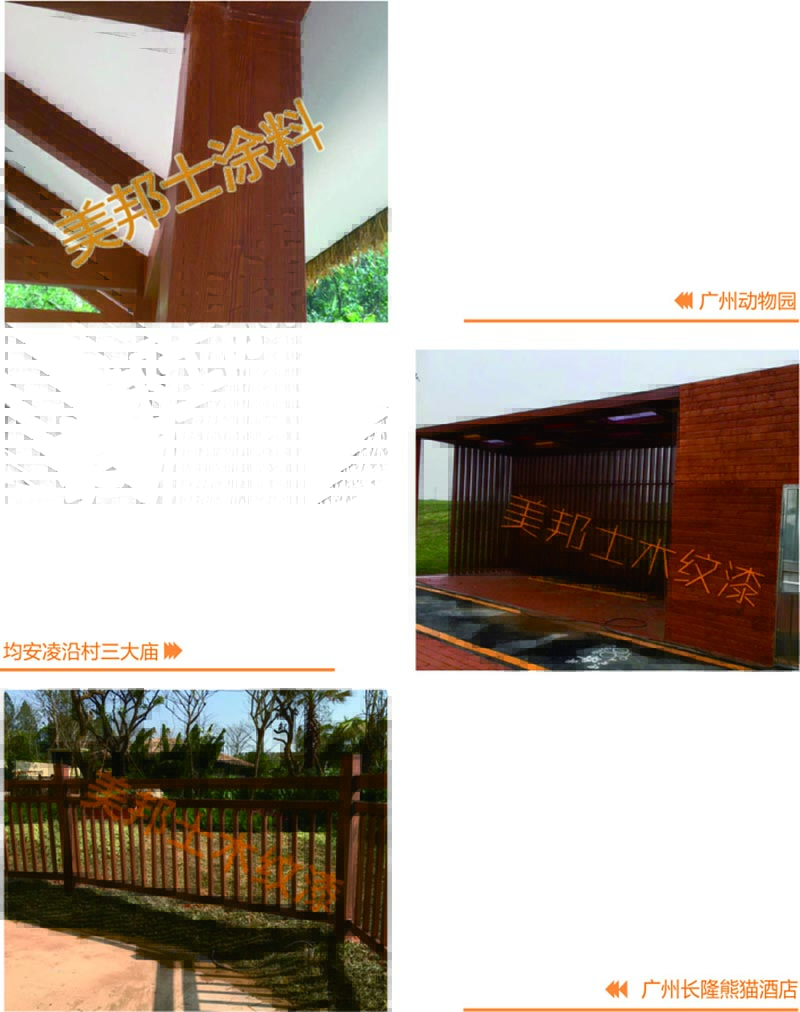 適用于辦公樓、賓館、住宅、廠房等外墻涂裝,車庫上方葡萄架、廊架、鐵架、涼亭等鋼結構木紋外觀涂裝。