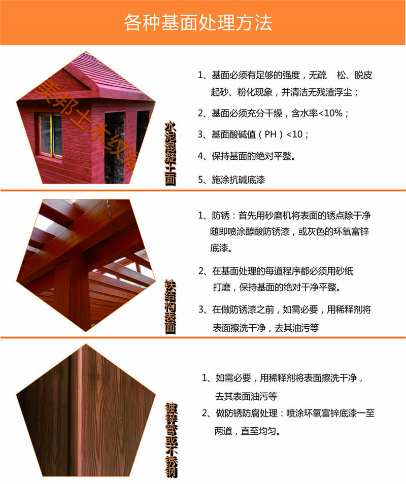| 1、基面必須有足夠的強度,無疏松、脫皮、起砂、粉化現象,并清潔無殘渣浮塵; 2、基面必須充分干燥,含水<10%; 3、基面酸堿値( PH) <10 4、保持基面的絕對平整. | 1、鐵結構處理方法:先用砂紙磨掉,噴涂鐵紅色防銹漆,,氧樹脂或淺灰色的環氧富鋅底漆,接下來再做抗堿底漆。 2、 在基面處理的每道程序都必須用砂紙打磨,保持基面的絕對平整。 | 1、鋼結構或金屬表面處理方法:先用砂紙打磨,噴漆環氧樹脂或灰色的環氧氟鋅底漆。 2、在基面處理的每道程序都必須用砂紙打磨,保持基面的絕對平整。 |
