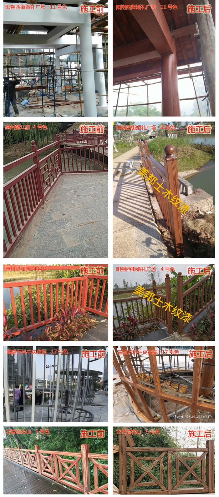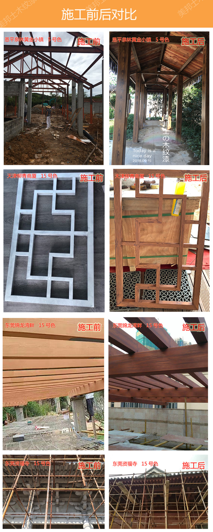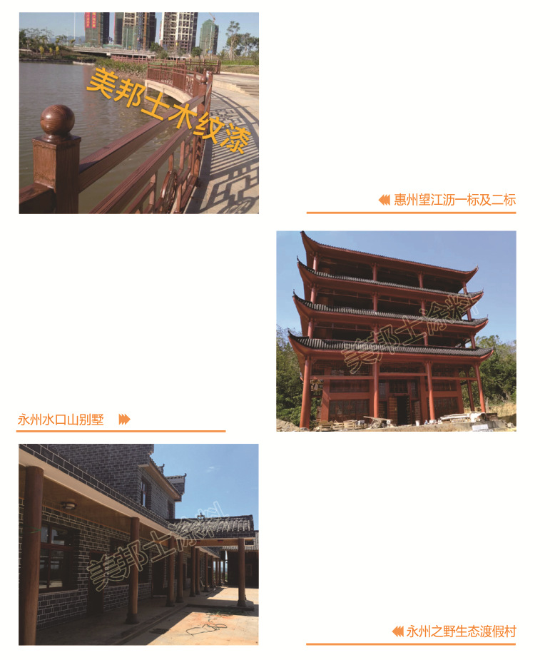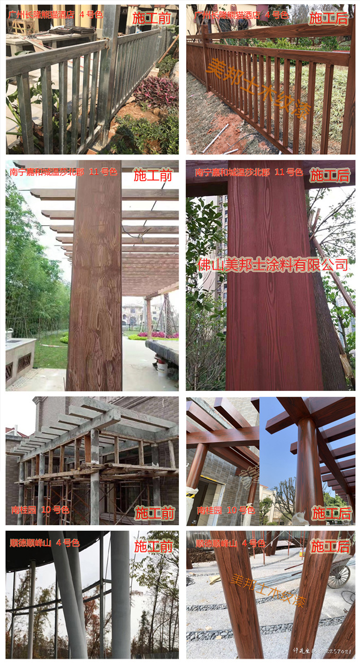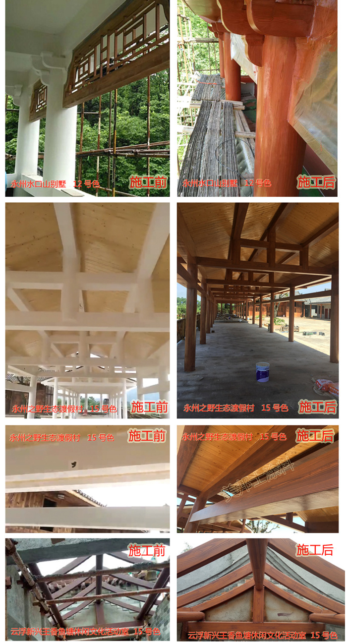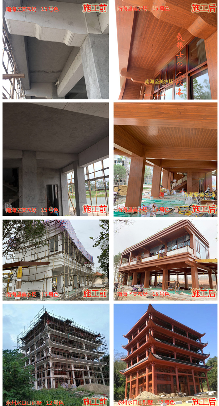 適用于辦公樓、賓館、住宅、廠房等外墻涂裝,車庫上方葡萄架、廊架、鐵架、涼亭等鋼結構木紋外觀涂裝。